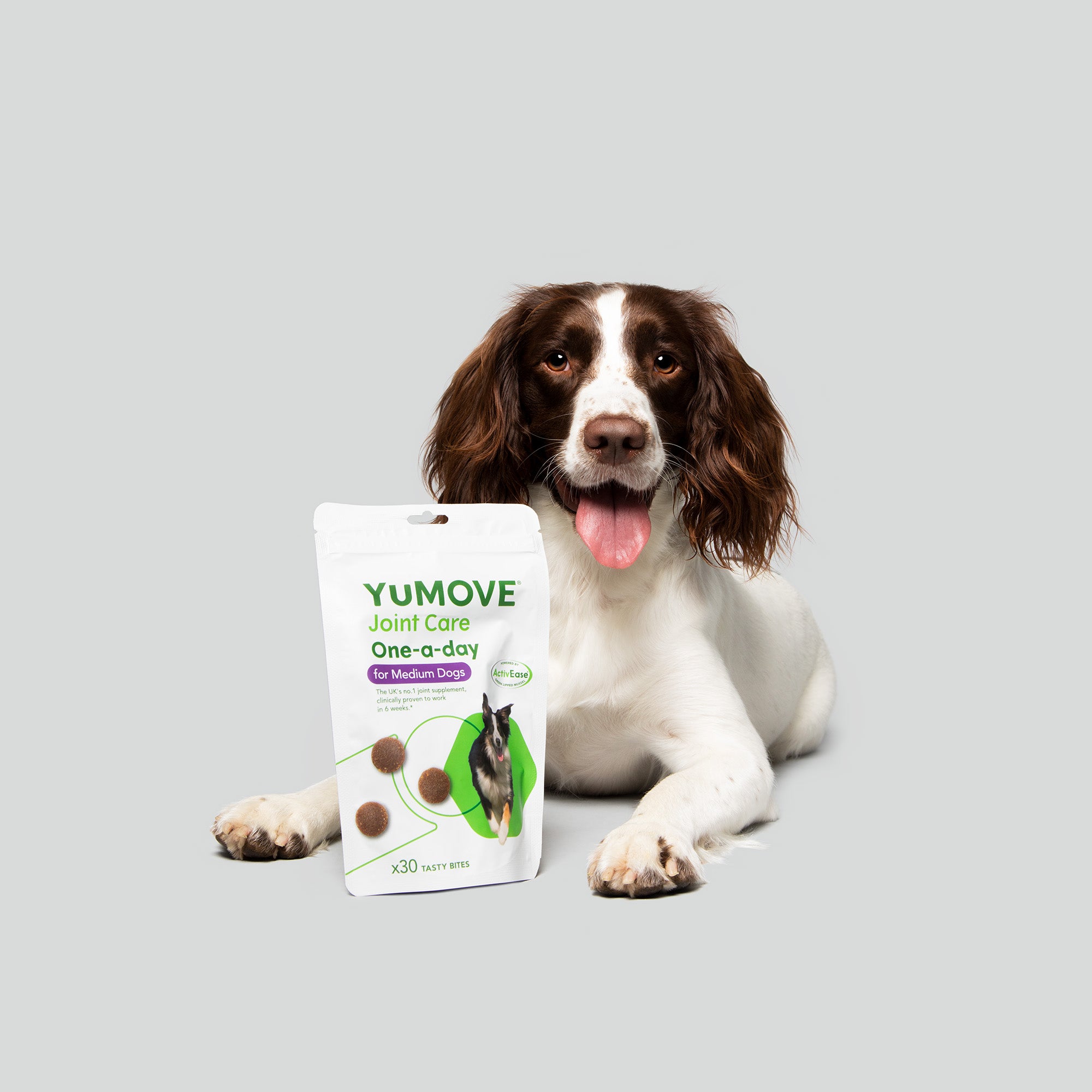 YuMOVE Joint Care One-a-day for Small, Medium and Large Dogs contains our Adult Dog joint formula that's packed with high-quality ingredients, like our unique and sustainably sourced ActivEase® Green Lipped Mussel. It gets to work on an adult dog's joints in three ways – soothing stiff joints, supporting joint structure and helping to aid mobility.